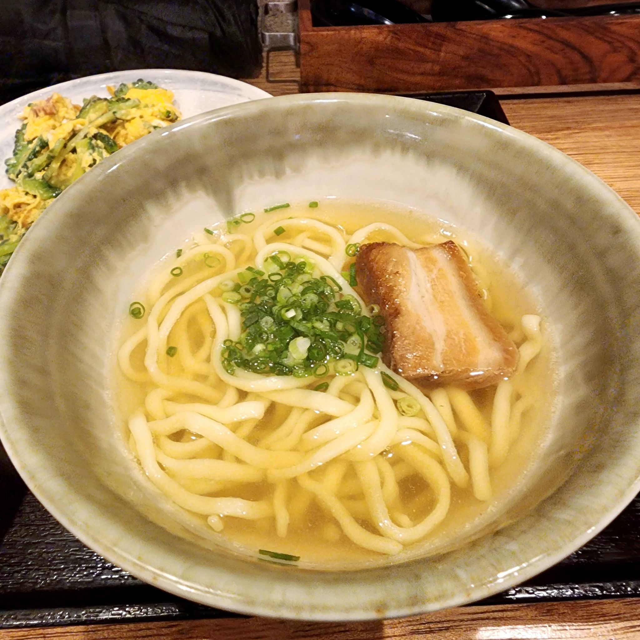 今回注文したのは「ゴーヤチャンプル定食」。ゴーヤチャンプルに加え、ミニサイズの沖縄そばもセットになった、ボリューム満点の定食です。