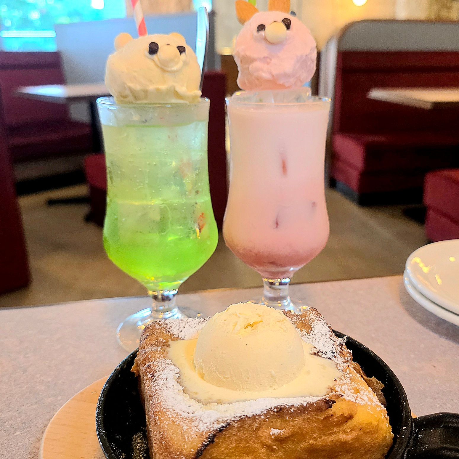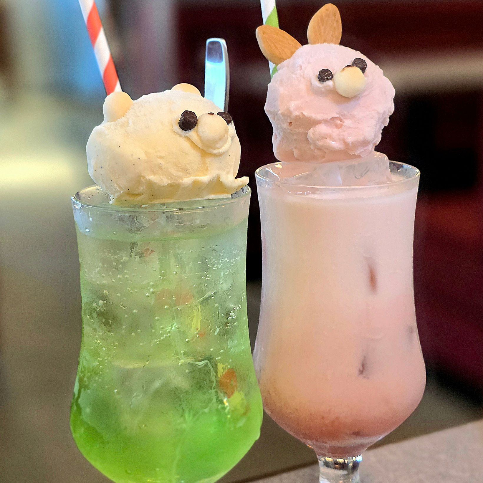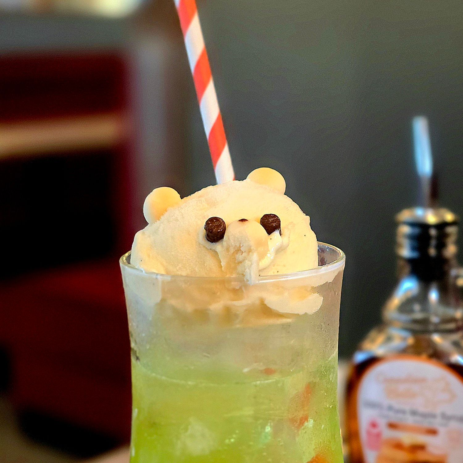 まず「くまさんアイス付きクリームソーダ(759円)」。メロンソーダに、ひょっこりと可愛いクマ型のアイスが乗っていて、見た目からして「映え」です。