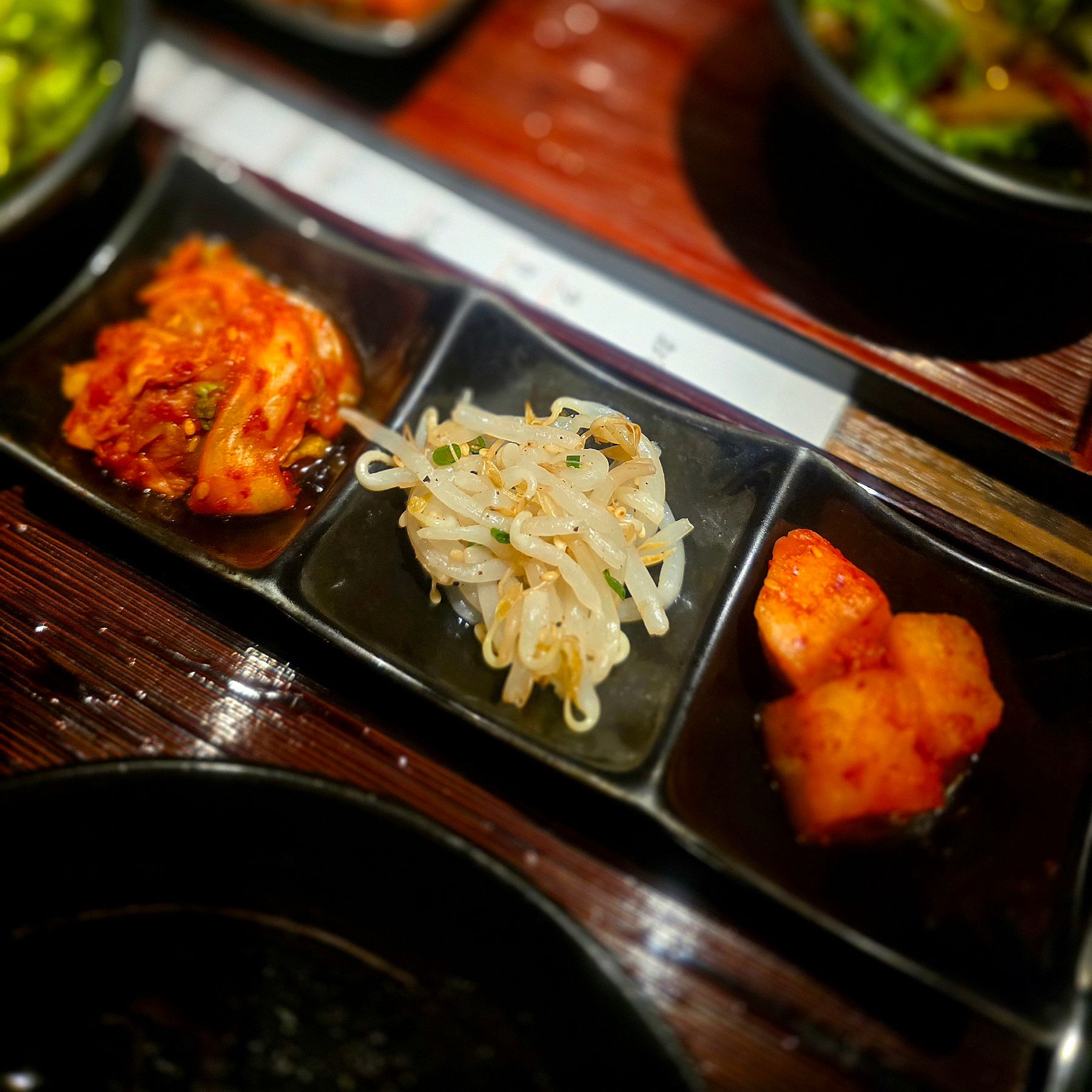 付け合わせはキムチ、カクテキ、ナムル。それからサラダとワカメスープ。