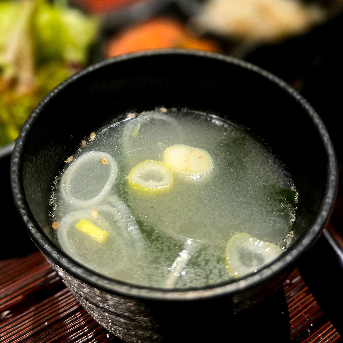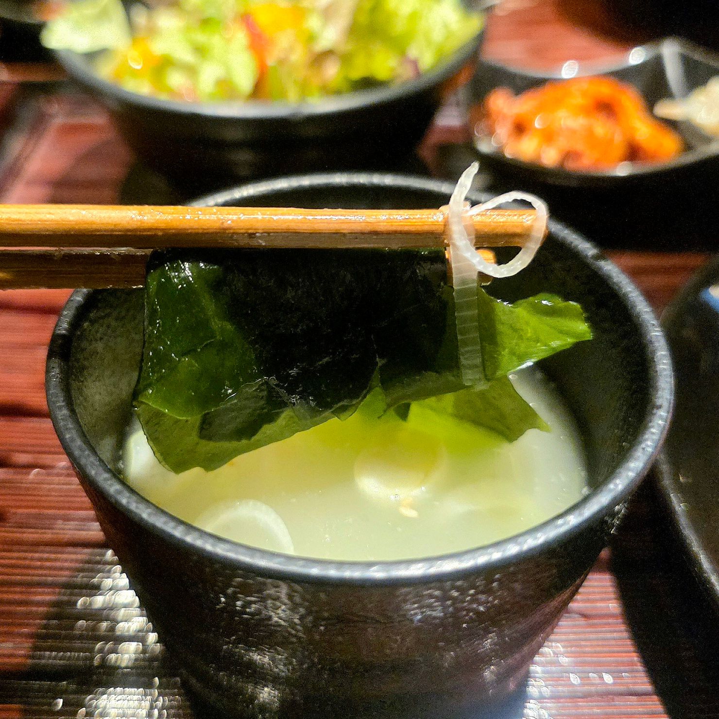 ワカメスープもやさしくて、肉と米で熱狂してる口内をすこし落ち着かせてくれる存在。