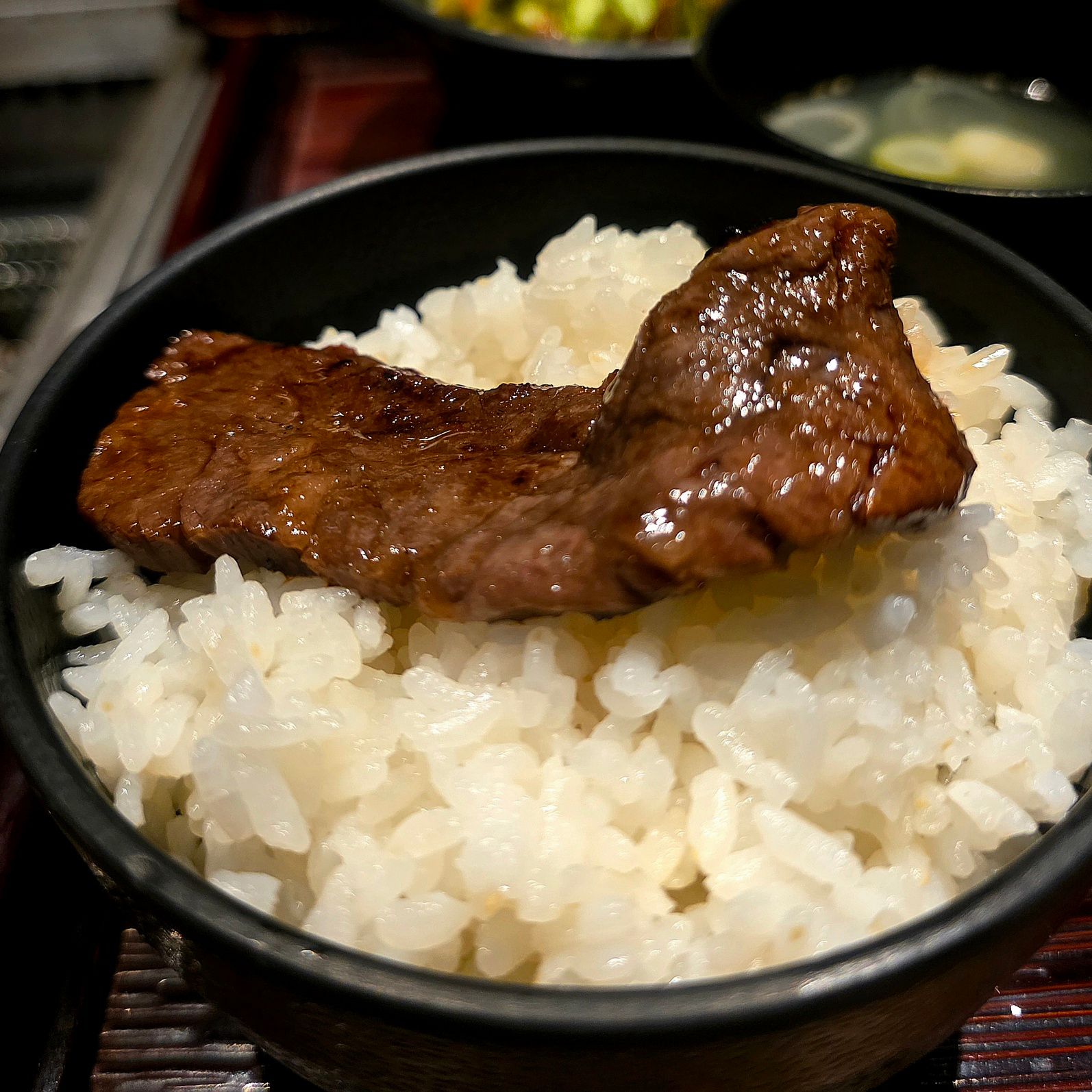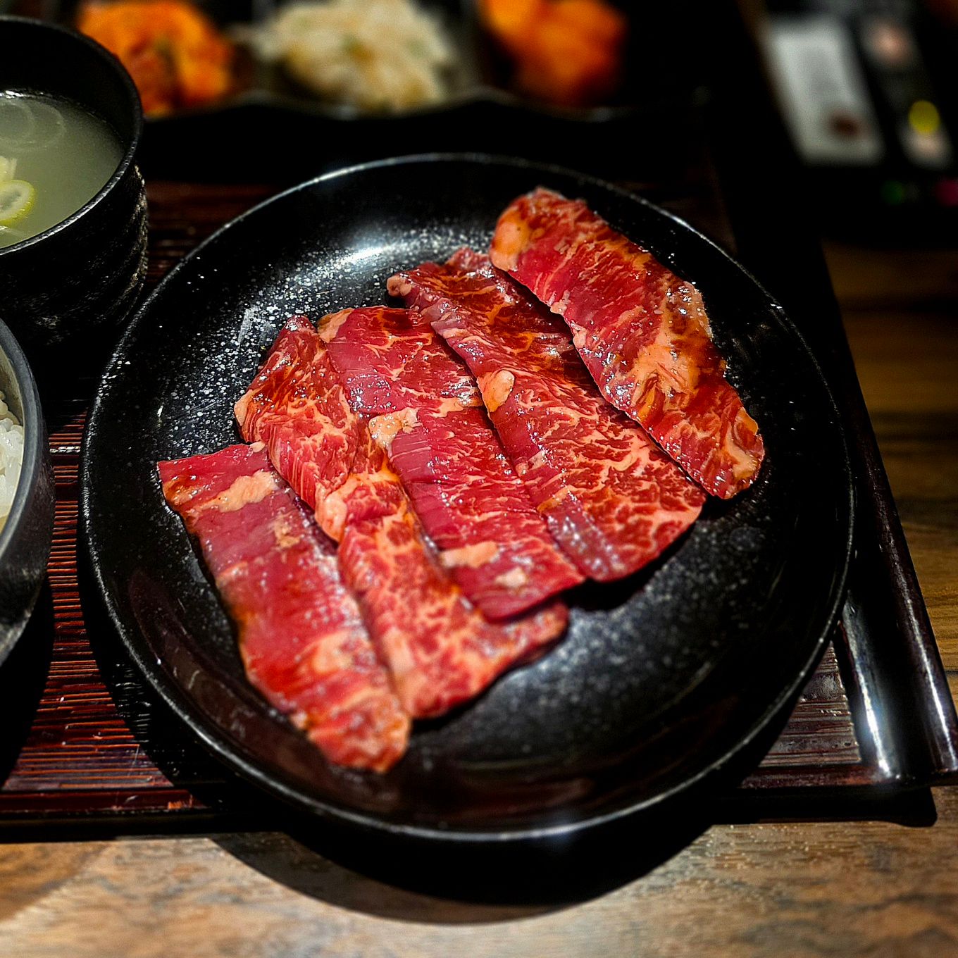 皿に並ぶハラミは、見た目からして美味しいのが確定しているやつ。艶、厚み、そして赤身の奥にあるうっすらとしたサシ。ランチでこれが出てくるの、普通に凄いです。