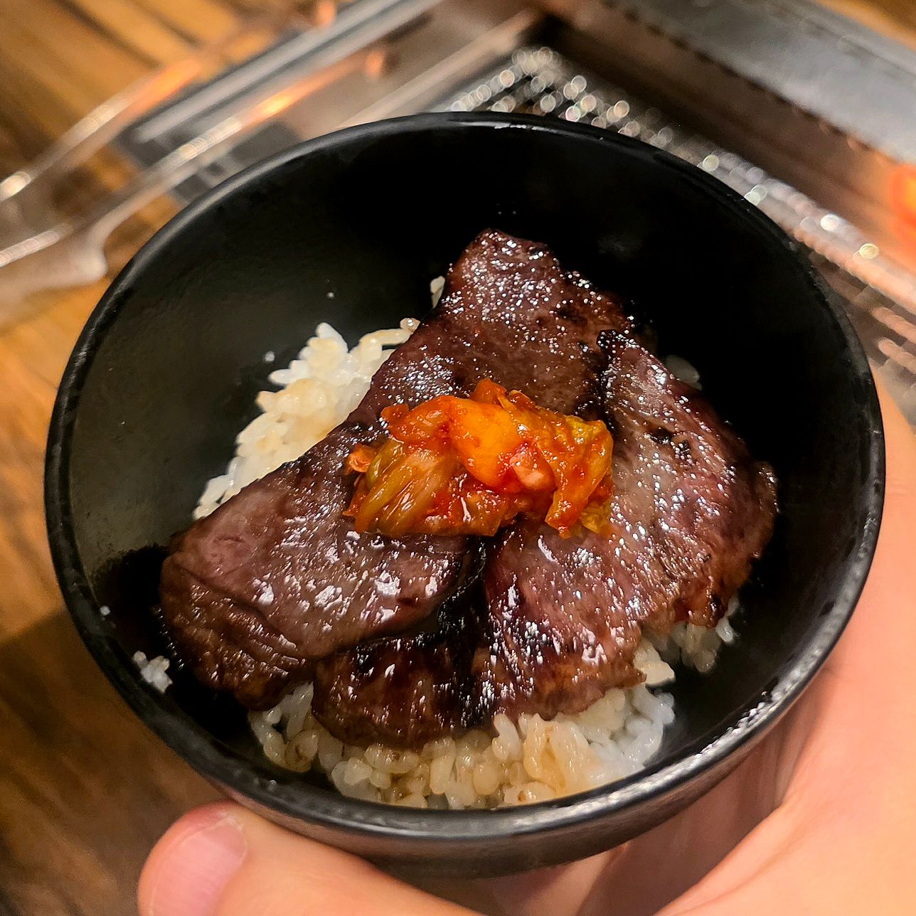 締めに「自作ハラミ丼」を決行。残ったハラミを全部焼き、ご飯の上へ、焼肉のタレをかけます。キムチを添えて完成。掻き込んだ瞬間、沈黙になります。言葉より、味が全部を説明してしまいました。